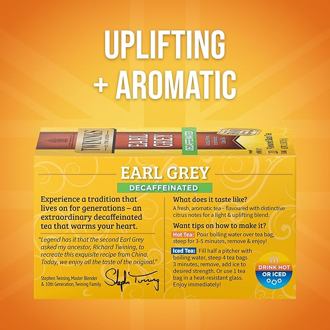 - CLASSIC BLACK TEA: Fresh, fragrant and flavoured with distinctive notes of citrus and bergamot, this Earl Grey tea has all the taste of the original; Decaffeinated, 20 Count, Pack of 1
