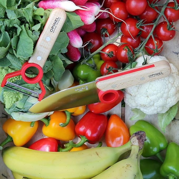 Opinel Le Petit Chef Complete 3 Piece Kitchen Set, Chef Knife with Rounded Tip, Fingers Guard, Peeler, For Children and Teaching Food Prep and Kitchen Safety, Made in France