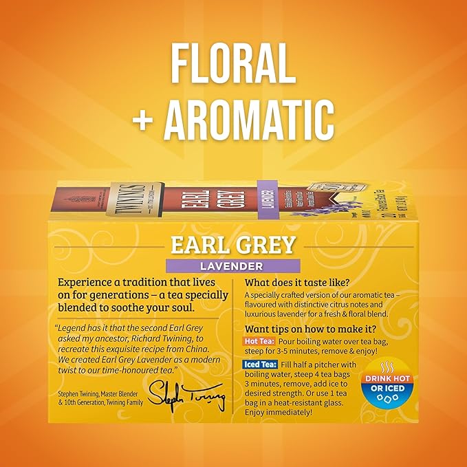 - CLASSIC BLACK TEA & FRESH LAVENDER: Fragrant and flavoured with distinctive notes of citrus and bergamot, this Earl Grey tea adds fresh lavender for even more aroma and taste; Caffeinated, 20 Count, Pack of 6