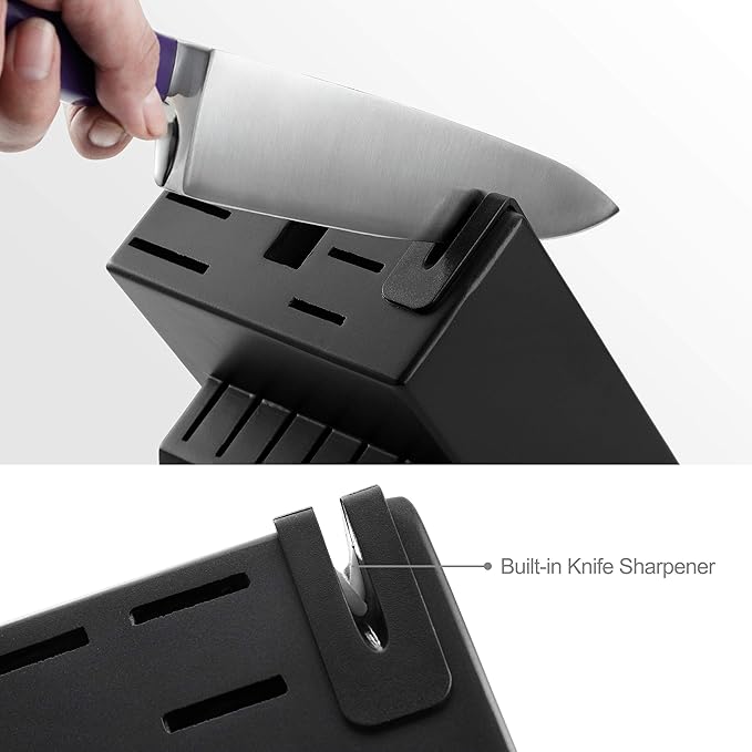 - Exclusive Built in Sharpner- Stainless steel knife block set with built-in sharpener is amazing. It saves you from having to honing blades on a sharpening steel.