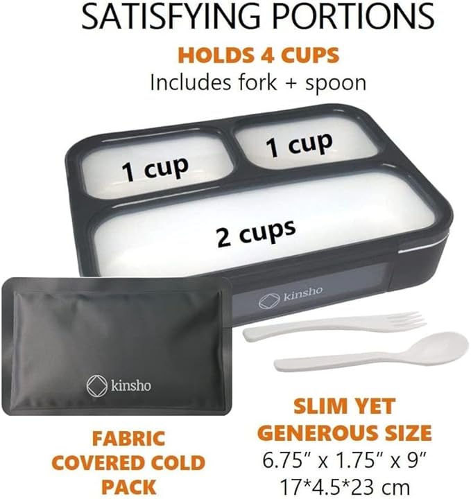 - WHAT YOU GET: *Authentic Kinsho bento box. *Insulated bag. *Deluxe fabric-covered ice bag. *Custom fit spoon & fork. *Kinsho Tips + Eats eBook with 60+ Bento tips + recipes from Kinshoβs founder (a mom & award-winning mindful cooking author). *Industry leading guarantee. *Customer support from our USA-based team.