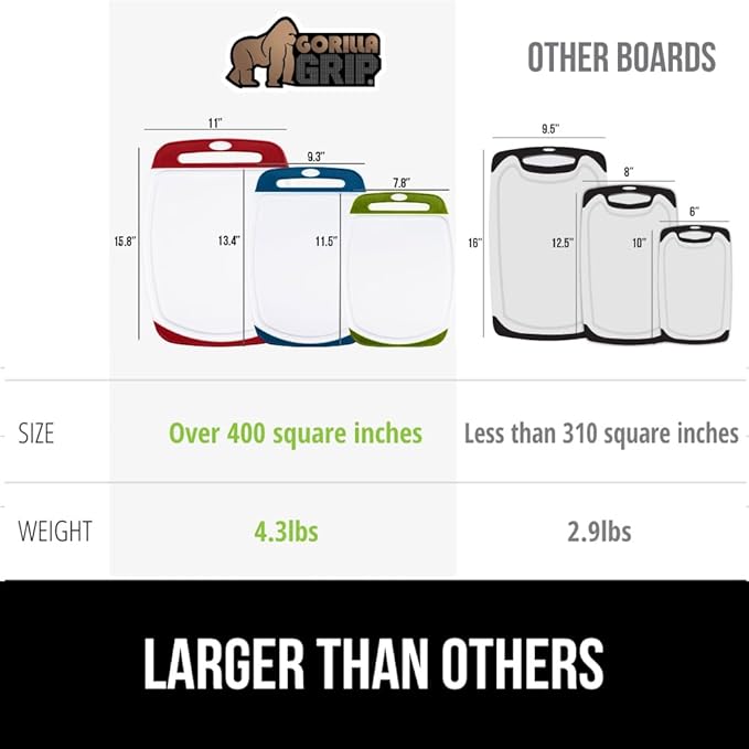 GORILLA GRIP BPA-Free Reversible Kitchen Cutting Board Set of 3, US Designed, Nonporous, Juice Grooves Catch Liquid, Slip Resistant Border, Dishwasher Safe Large Food Chopping Boards, Red Blue Green