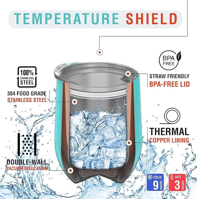 - Double Wall Vacuum Insulated Perfection in a stemless wine tumbler made from lifelong Stainless Steel! Set off on your refreshing picnic, hiking or camping adventures with your water, wine, or cocktail icy-cold for 9 hours or your coffee and tea scalding-hot for over 3 hours! It is an insulated stainless steel wine glass with a removable BPA-free lid, designed for sweat-free convenience! Use it as a wine glass tumbler