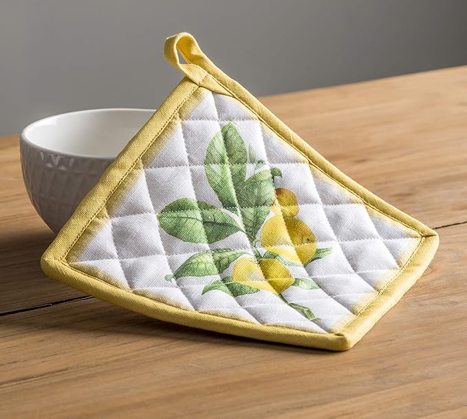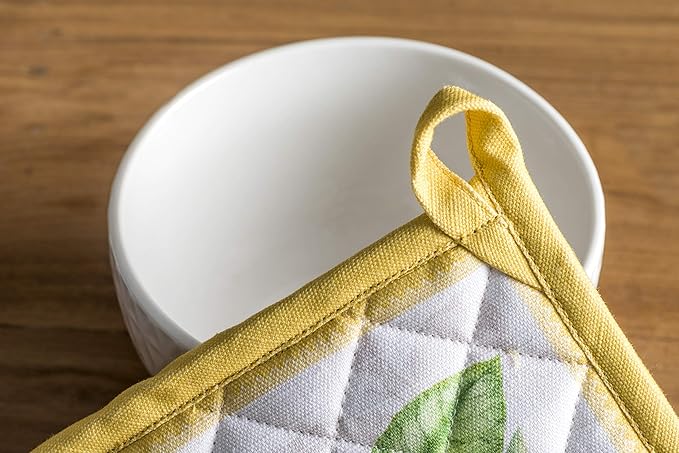 Maison d' Hermine 100% Cotton Oven Mitt & Pot Holder Set (7.5"x13" & 8"x8") Heat Resistant BBQ Cooking Gloves with Loop, Baking, Grilling, Kitchen, Handling Hot Pans Spring/Summer (Limoncello)