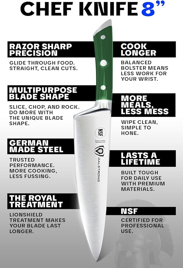Dalstrong Chef Knife - 8 inch Blade - Gladiator Series - Forged High Carbon German Steel - Razor Sharp Kitchen Knife - Professional Full Tang Knives - Army Green Handle ABS - Sheath - NSF Certified