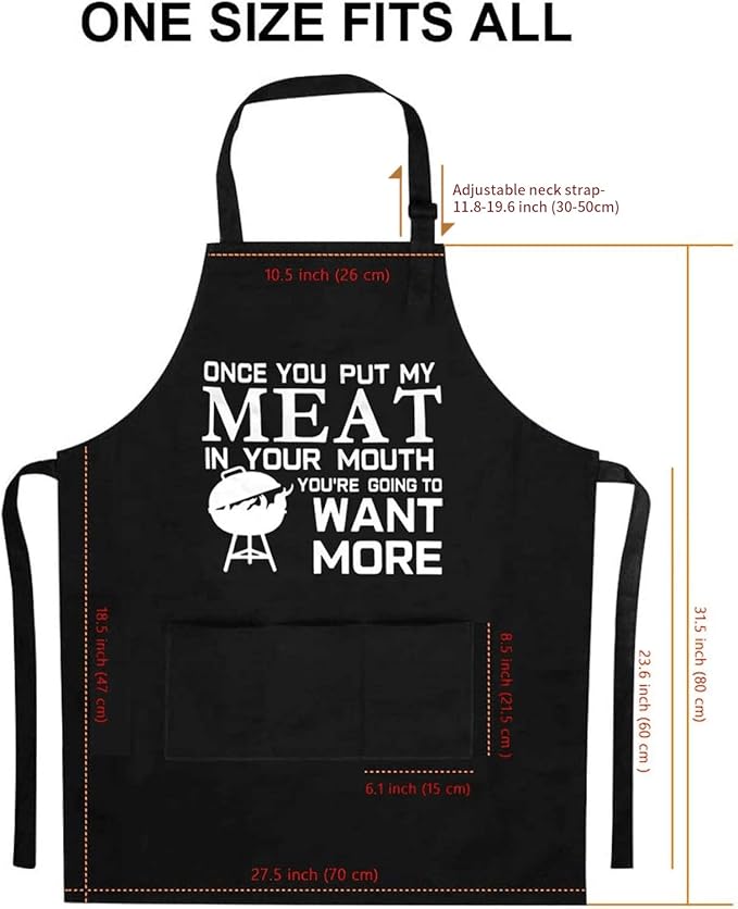 - Funny & Unique Design: YuanDe funny BBQ apron with hilarious saying"Once You Put My Meat In Your Mouth, You’re Going To Want More", mans apron cooking great for indoor and outdoor use, whether you are cooking, baking, barbecuing or doing some housework