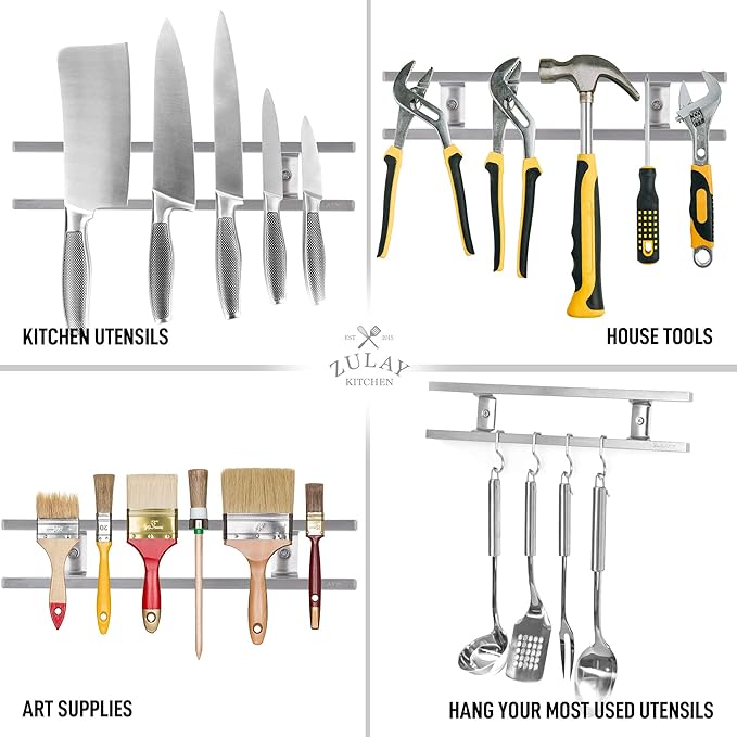 - The Ultimate Space-Saving Organizer: Save precious countertop and drawer space while adding the perfect elegant touch with the Zulay Kitchen Magnetic Knife Strip. Made with high quality 304 stainless steel built with powerful Neodymium magnets, it’s designed for holding small to large knives with ease. Note: knives and utensils NOT included.