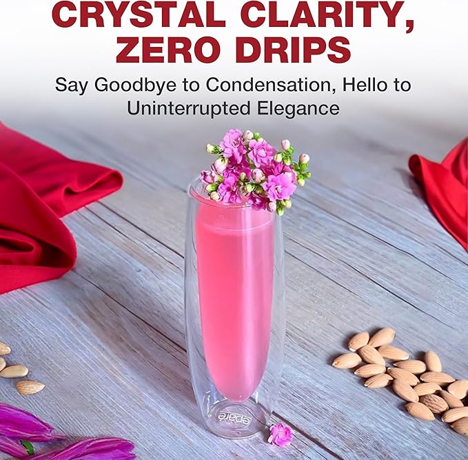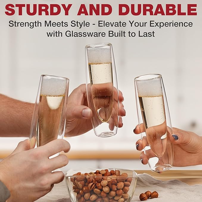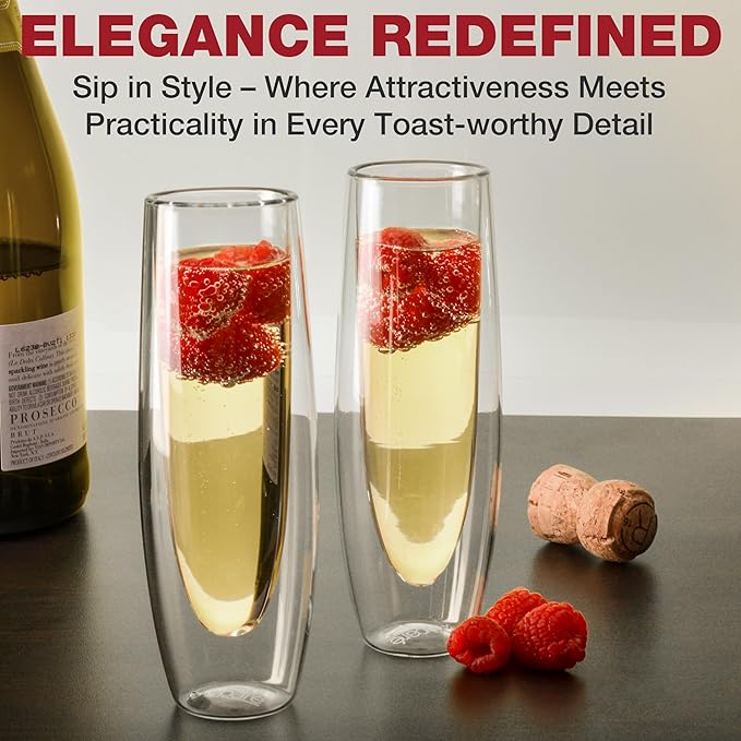 - Contemporary Double Wall Design: These stemless double wall champagne flutes keep drinks colder longer and reduce condensation. Sleek and modern, they add a stylish touch to brunches, weddings, and champagne toasts.