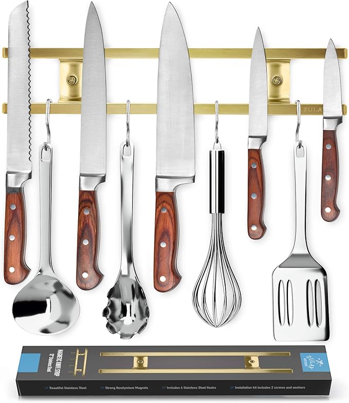 - The Ultimate Space-Saving Organizer: Save precious countertop and drawer space while adding the perfect elegant touch with the Zulay Kitchen Magnetic Knife Strip. Made with high quality 304 stainless steel built with powerful Neodymium magnets, it’s designed for holding small to large knives with ease. Note: knives and utensils NOT included.