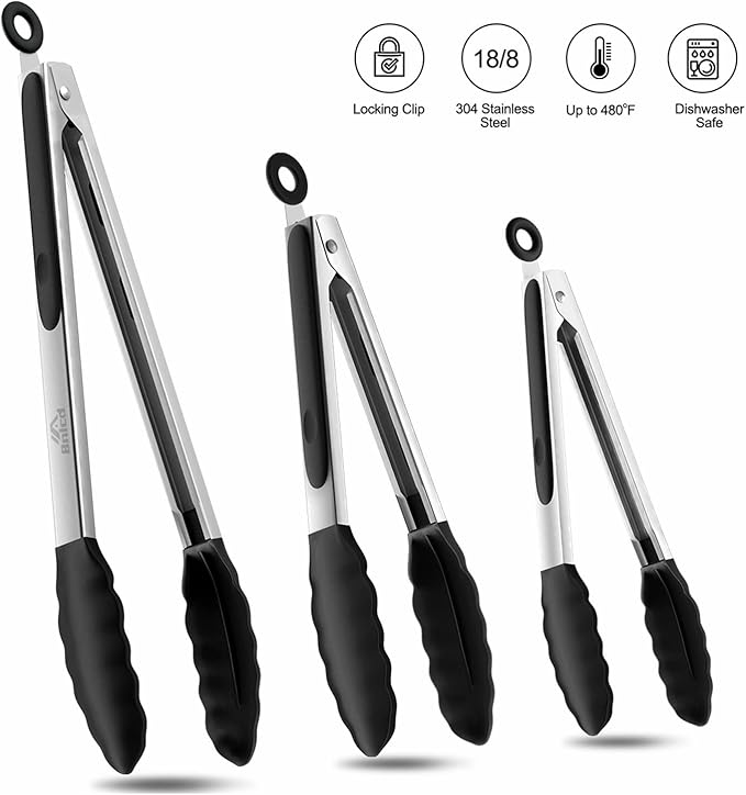 - MULTIPLE APPLICATIONS : Bnlcd kitchen tongs set contains 3 sizes - Small 7", Medium 9", Large 12", making it perfect for basic kitchen tasks, be it used indoors or outdoors. You can use it to grill corn, flip burgers, make salads, cut roast fillets or simply as a BBQ tool. It also makes a great gift for family and friends.