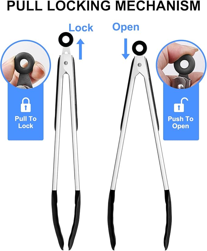 - LOCKING MECHANISM & PULL-RING TECHNOLOGY : Our pull ring technology will keep the food tongs from opening and closing accidentally which will allow you to facilitate better control while using them, simply pull the ring to lock and push to unlock. You can hang it on the wall also with the ring after using, or pull the ring to lock it and store in the drawer to save space.