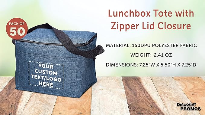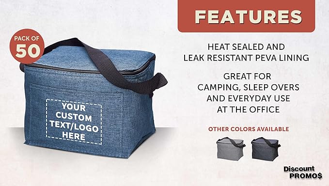 DISCOUNT PROMOS Custom Insulated Cooler Lunch Bag Set of 50, Personalized Bulk Pack - Perfect for Work, Travel, Outdoor Events - Blue