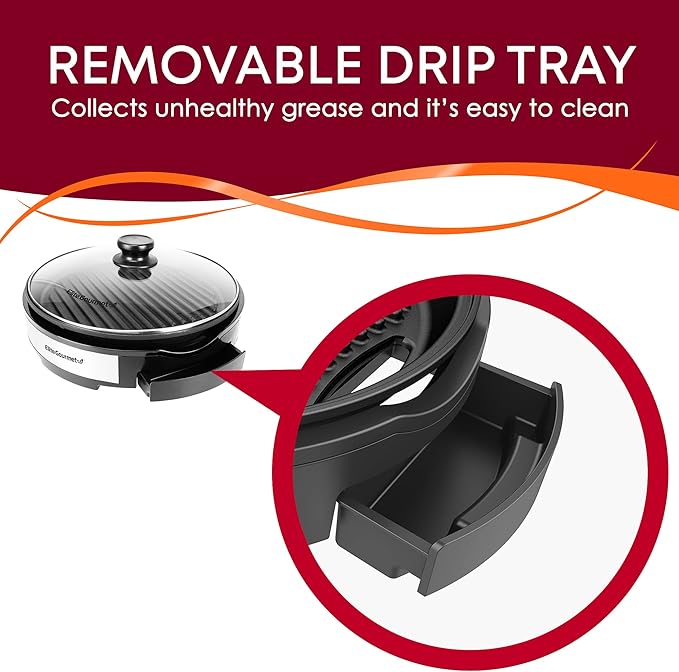 - SAVE TIME & GRILL ALL YOUR FAVORITE FOODS AT ONCE! – Now you can throw your steaks, your wife’s veggies, your son’s ribs and your daughter’s salmon on the large 12" grilling surface at once! And thanks to its reliable nonstick coating, you’ll never have to deal with stuck food again! Plus, there’s a removable 120V/1200W thermostat control with 5 adjustable settings up to 450°F.