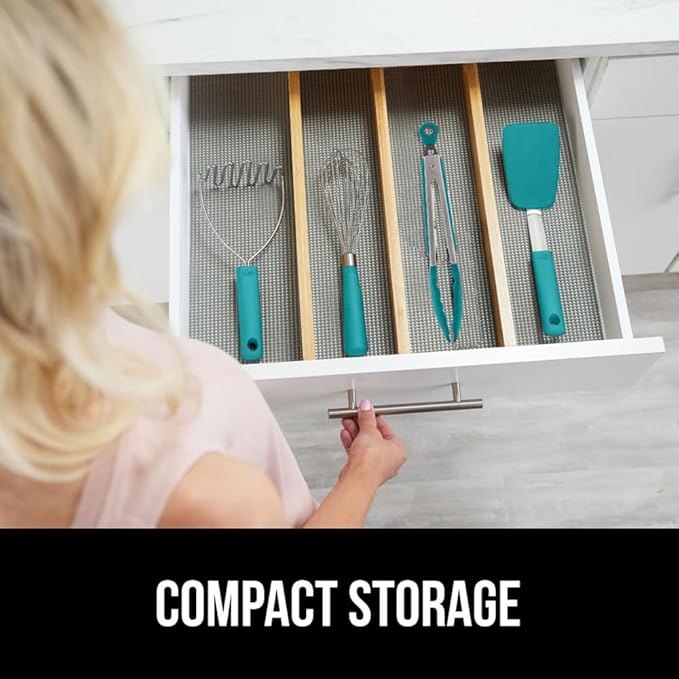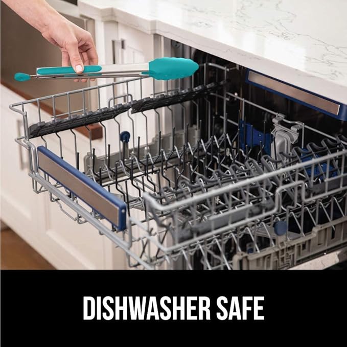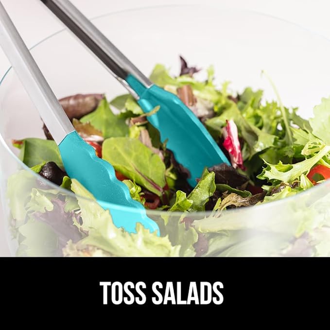 GORILLA GRIP Stainless Steel Heat Resistant Kitchen Tongs for Cooking, Set of 2 BBQ Tong, Non Scratch Silicone Tip for Pans, Strong Grip, Grab Food, Salad, Air Fryer, Pull Lock, 7 + 9 Inch, Turquoise