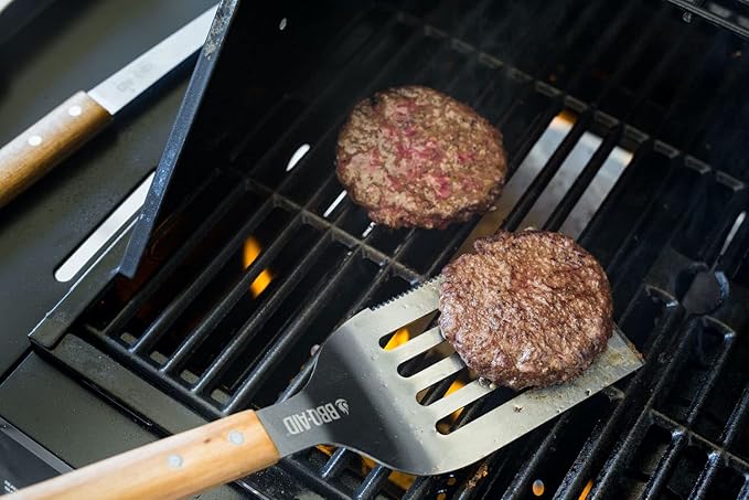 - MAKES A GREAT GIFT FOR BBQ LOVERS - Our Pro BBQ turner spatula is an absolute crowd pleaser, beautifully crafted, and of obvious quality. This tool is built with thick stainless steel, ensuring it will not bend or break, the wood handles are comfortable, and it's designed for durability.