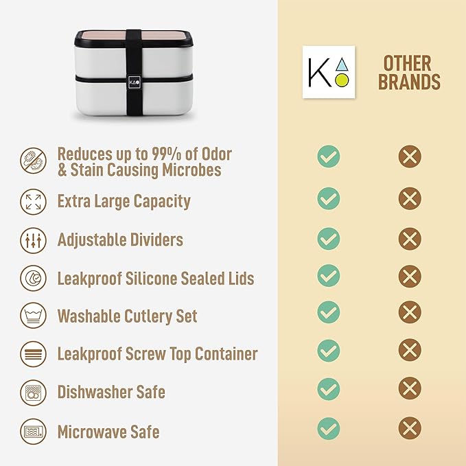 - Quick and Easy Meals On-The-Go: When you live a busy life, finding fresh, healthy meals can be difficult. Thankfully, with the KARRICO double bento box, you can sustain your health regimen on the go. Our sealed stackable containers come with leakproof lids and a knife, fork, and spoon that conveniently clips under the top cover. There are also adjustable dividers and a separate leakproof screw-top tub for sauces or dressing.