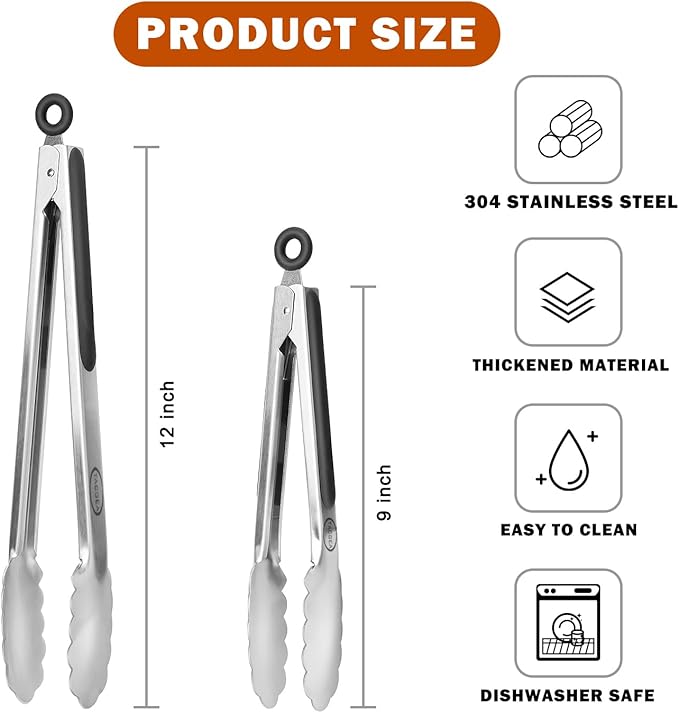 - 【PROFESSIONAL QUALITY STAINLESS STEEL】Made of thick, corrosion resistant stainless steel, carbon free, sturdy, heat resistance, anti-rust. Set of 2 essential kitchen tools, including 9” and 12” grill tongs, which can meet your various cooking needs.