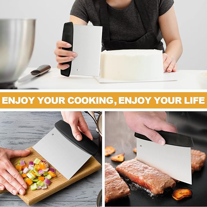 - MULTIPURPOSE GRIDDLE TOOLS - Sharp beveled edges for great turning, lifting, frying and cutting, 45° angled structure design can keep them balance well on any flat top, teppanyaki, hibachi or cast iron skillet, Bench scraper helps you to remove burned food and keeps your griddle clean