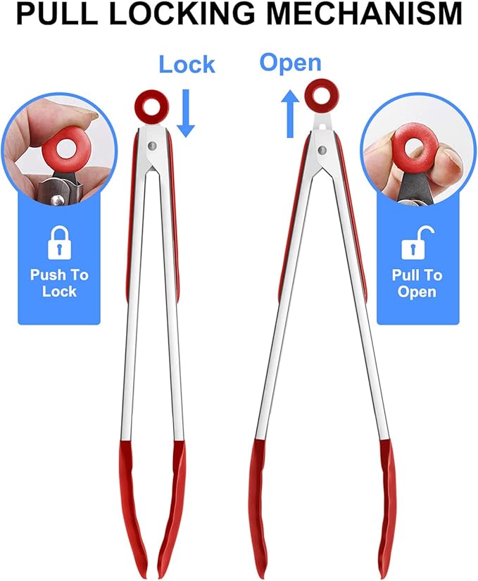 - LOCKING MECHANISM & PULL-RING TECHNOLOGY : Our pull ring technology will keep the food tongs from opening and closing accidentally which will allow you to facilitate better control while using them, simply pull the ring to lock and push to unlock. You can hang it on the wall also with the ring after using, or pull the ring to lock it and store in the drawer to save space.