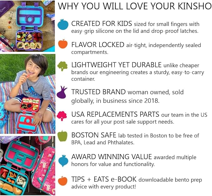 - BONUS Bento Tips eBook for Moms – Each of our kid’s bento box containers also comes with a complimentary 100-page Tips + Eats eBook written by the mom and award-winning mindful eating author who founded kinsho.