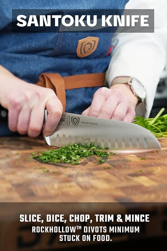 - Three blades to rule the Kitchen: The 8” chef knife for portioning thick cuts of meat, tough squash, or root vegetables. The 7” Santoku for slicing, dicing, or mincing, and the paring knife for fine detail work or preparing small fruits, vegetables, or mushrooms.
