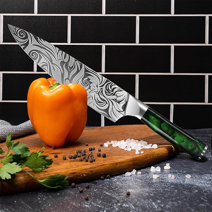 SENKEN 8-piece Engraved Japanese Kitchen Knife Set & Beautiful Green Resin Epoxy Handles - Wasabi Collection - Chef's Knife, Bread Knife, Cleaver Knife, Paring Knife, & More