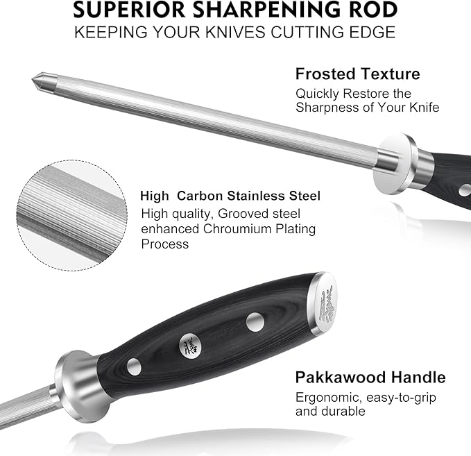 - 【Fiberglass G10 Handle, Comfortable Grip 】 Adopts frosted glass fiber G10 handle which is much more comfortable and solider than the wood handle, it becomes an ergonomically designed top-balanced professional knife to provide high-performance cutting for meat, vegetable, and fish.