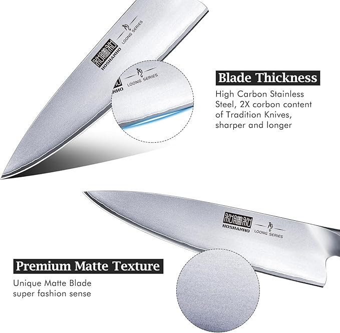 - 【High-End Japanese Steel Chef's Knife】 HOSHANHO chef's knife is made of Japanese high carbon steel 10Cr15CoMoV, 2x of the sharpness and durability of some other “premium” knives, and it owns a very high cost performance! With a hardness of up to 60 HRC, the kitchen knife offers excellent rust resistance, sharpness and durability.
