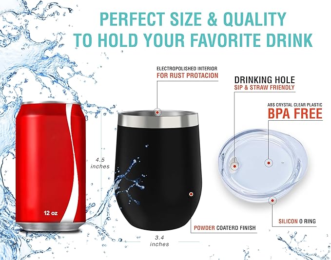 - GET A MODERN, EYE-CATCHING 12 Oz WINE TUMBLER that will add color to your life! Comfortable in the hand, portable and lightweight to take on your outdoor adventures! Worry no more about your little adventurers breaking their smoothie/juice/water or milkshake cups. UNBREAKABLE and SAFE for kids, teenagers and adults, it is a cute, trendy and youthful colored metal wine glass, your #1 choice in home/camping/holiday/sports/ travel stainless wine glass to go!