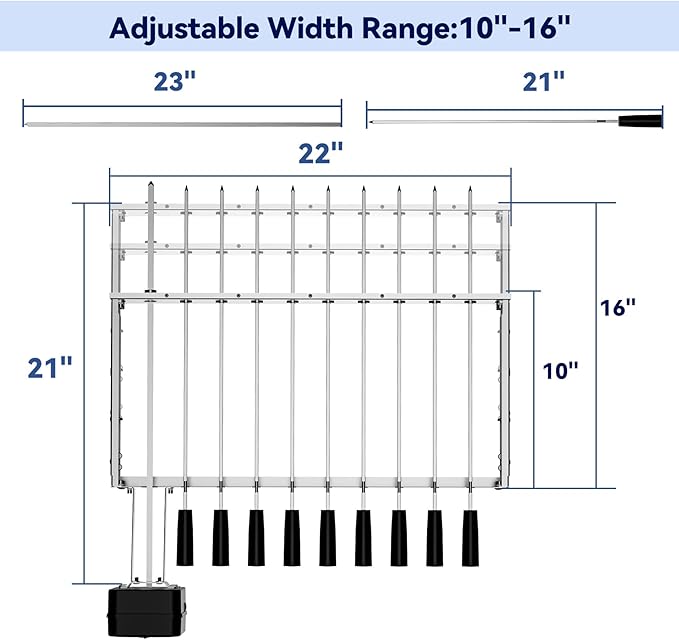 - Adjustable Speed Function - Our electric skewer turner can adjust speed, roast food at the most suitable speed to ensure that it will not burn, the speed is adjustable with the knob from 1.5-7RPM. Extended 21β length skewer sticks can skewer more foods at one time, and keeps your hands away from the heat. Perfect for grilling chicken, fish, steak, pepper, vegetables, sausages, shish, kebabs and so on.