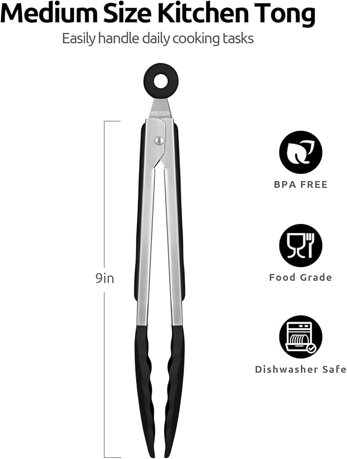 600ºF Heat Resistant Kitchen Tongs: U-Taste 9 inch Silicone Cooking Tong with Firm Sealed Non Stick Rubber Tips & Silicon Coated 18/8 Stainless Steel Handle & Smooth Locking for Serving Salad (Black)