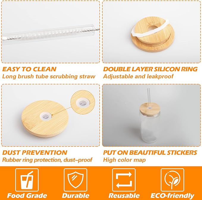 - [WHAT YOU GET]: The glass cups set includes 2 glass cups, 2 nature bamboo lids, 2 reusable glass straws and 1 cleaning brushes.