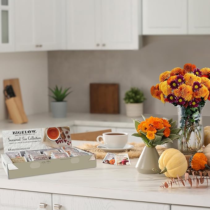 - Seasonal Tea Collection: 64 Bigelow tea bags that include 8 caffeinated tea bags each of Pumpkin Spice, Salted Caramel, Hot Cinnamon, Eggnogg’n, and Caramel Apple and 8 decaffeinated tea bags each of Cranberry Harvest, Peppermint Bark and Ginger Snappish for a tea gift set that makes for the perfect holiday gift