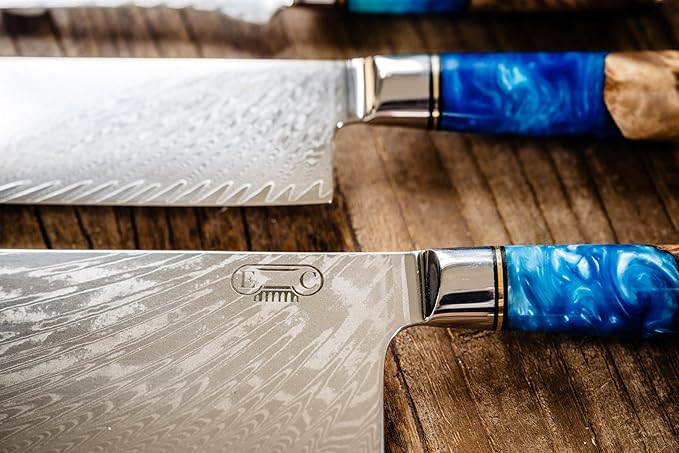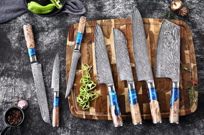 Epicurean Cook Tidal Collection 8 PCS Damascus Knife Set Japanese Kitchen Knives with VG10 Steel Core Ultra-Sharp Professional Chef Knife Set with Elegant Box and Blue Resin and Burl Wood Handles