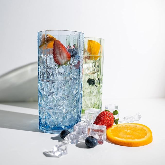 - Elegant Crystal Cut Glasses for the Modern Host: Sturdy and elegant, the classy Myrtle Beach tall plastic drinking glasses from Bellaforte can easily steal the show at any party. With a capacity of 18 oz, our glasses are great for beverages like cocktails, juices, teas and smoothies