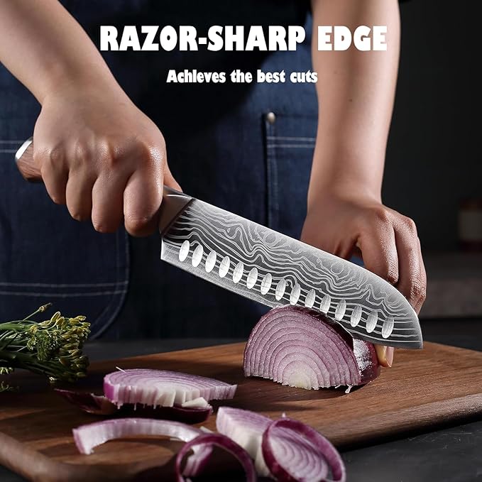 - Multifunctional Knives Sets:This kitchen Santoku knivfe easily handles your everyday kitchen tasks like chopping, slicing, chopping, chopping fruits, vegetables and a variety of meats including fish, chicken and beef. The concave pattern designed on the blade not only improves the aesthetics, but also reduces the cutting resistance and prevents the meat from sticking to the blade. It is truly an all-rounder cooking knife and the first choice of home cooks and professionals alike