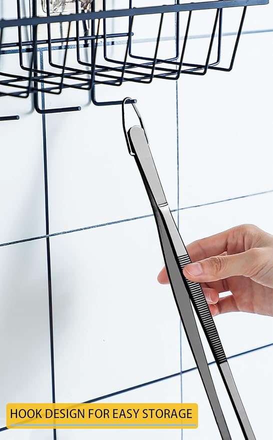 - ERGONOMIC DESIGN - These tweezers design with comfortable ergonomic shape, precision tweezer food tongs to protect your movements. The tip of the cooking tweezers is slender and easy to hold and extend into a narrow space. The hook design at the rear makes it easy to store and hang in any corner of the kitchen.