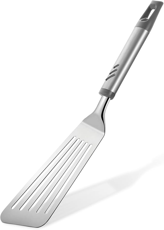 - 【Slotted Spatula Design】High-grade stainless steel spatula with drainage slots ideal for draining cooking liquids or oils of foods quickly. Less oil makes food healthier, and keep food clean & dry easily