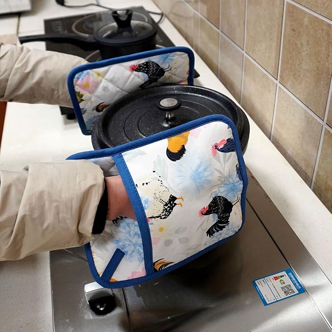 Pot Holders Set of 2 Heat Resistant 480℉ Kitchen 100% Cotton Comfortable Lining Printing Fox Flower Women Men Home Cooking Baking Microwave BBQ Gift (Rooster potholder)