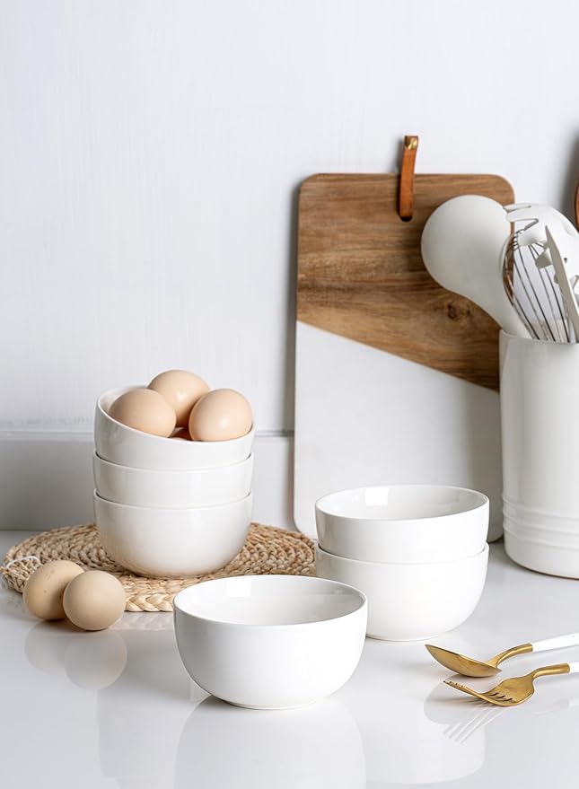 Sweese 10 Oz Porcelain Bowls Set of 6 - Versatile for Cereal, Soup, Salad, Pasta, Oatmeal - Microwave Dishwasher Safe, White