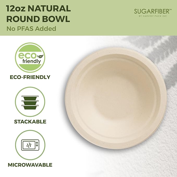 [600 Count] Harvest Pack PFAS Free 12oz Round Compostable Paper Bowls Bulk, Disposable Heavy-Duty Eco-Friendly Bagasse Bowls, Sugarcane Natural Plant fibers for Meal Prep Takeout Dinnerware