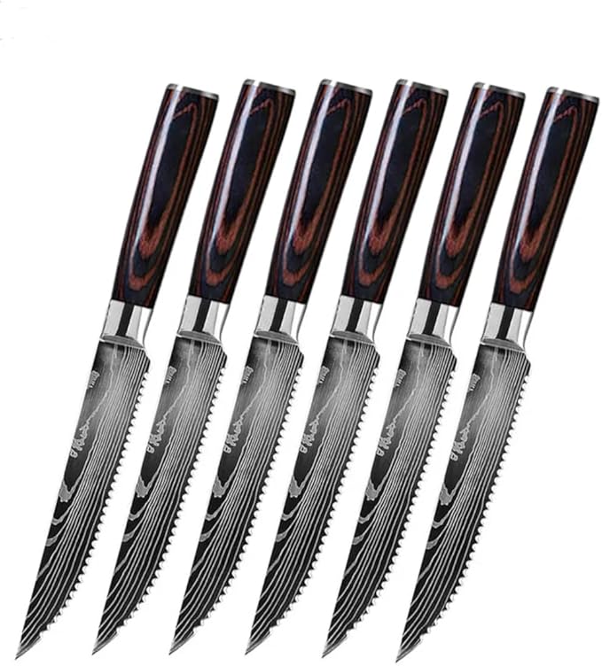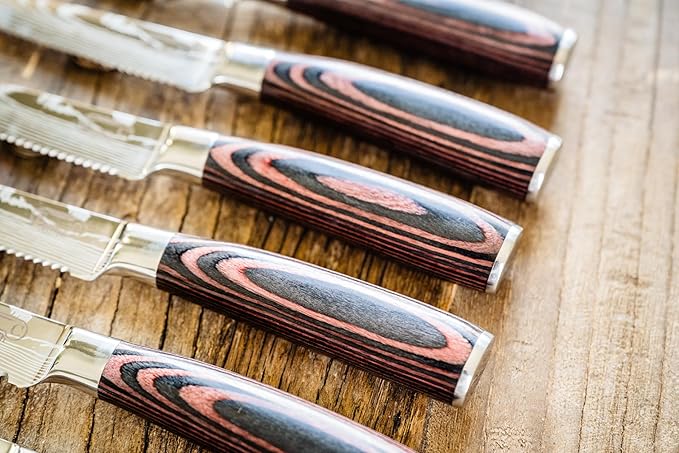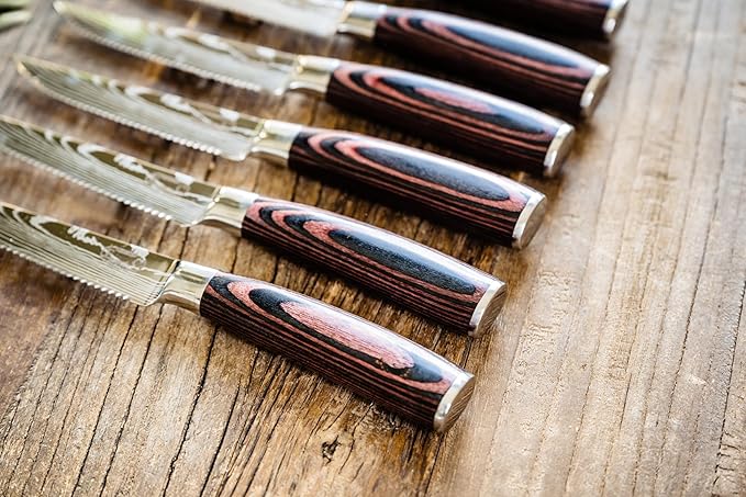 Majesty Series Professional Steak Knife Set with Damascus Pattern - Razor Sharp Serrated Stainless Steel with Wooden Handle (Set of 6 Steak Knives)