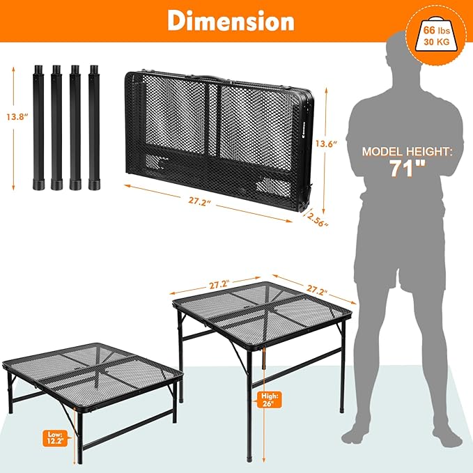 - [Adjustable Grill Table]The folding camping table allows you to adjust the height of the camping table from an initial height of 12.2 inches to a height of 22 inches,providing a perfect surface for you to picnic on the grass or grill standing up