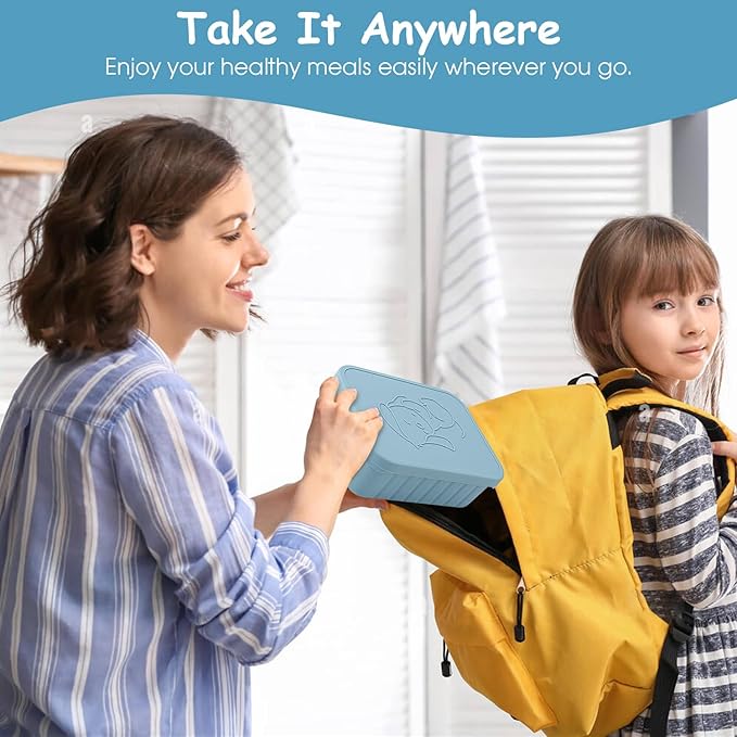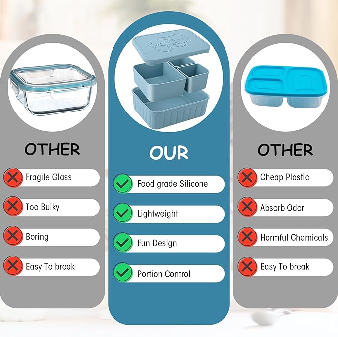 - 【Say Goodbye to Mess】The silicone bento box lunchbox for Kids has individual compartment to keep food neat and separate. The leak proof silicone lids seal tightly around the lip of the container and ensure that the box remains tightly sealed during transport, preventing any spills or accidents. Easy to open and close for little fingers. Meanwhile,anti-slip design make the silicone bento box more safe