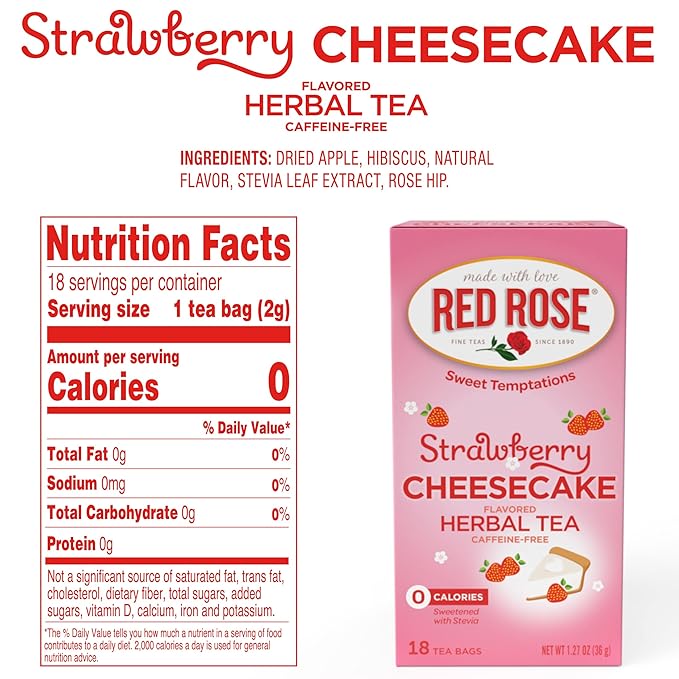 Red Rose Sweet Temptations Dessert Tea Strawberry Cheesecake, Zero Carbs, Zero Sugar Bursting with Flavor Caffeine-Free Delicious Beverage Herbal Tea, 18 Count Pack of 2 Fruit Naturally Flavored Herbal Tea