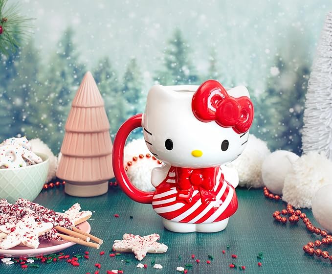 - HELLO KITTY HOLIDAY: Festive mug features Hello Kitty in a candy cane dress. Adorned with an adorable bow, this kawaii character is showcased in amazing detail, making this mug a great addition to any fan’s collection.