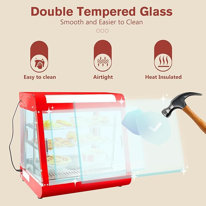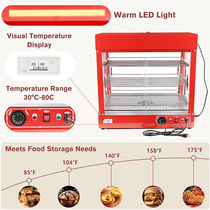 Whalefall 3-Tier Food Warmers Countertop, 27 inch Commercial Warm for Food Pizza Warmer w/ 3D Heating with Stainless Frame Sliding Glass Doors Pastry Display Case for Buffet Restaurant,Red