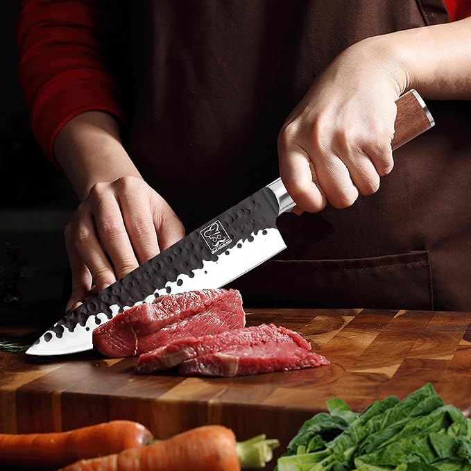 - ✔【Hammered and forged craftsmanship】Knives are built to a high specification, retaining some of the traditional hand craftsmanship,respect for the traditional straight handle design.All knives forged from 2mm high carbon x50Cr15 stainless steel food grade, with the edges polished at 8-12°by hand,that keep each edge extra sharpness.