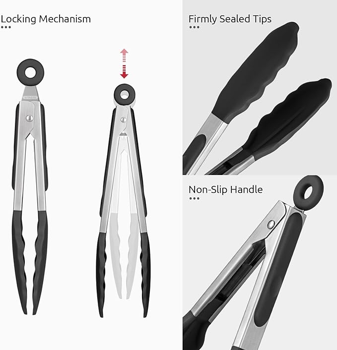 - [Heat Resistant Silicone Tips without Melting & Odor] The silicone tipped tongs are made of Food Grade silicone, which is more Sturdy and has higher heat resistance (up to 480℉) than the basic. The silicone tips make them a great partner for your nonstick pans and pots. No more sharp tips to scratch or ruin your cookware. They are heat resistant, so no more silicone parts of the tongs melt off with heat again! Thanks to fine workmanship, the silicone tips firmly sealed on never lose its grip.
