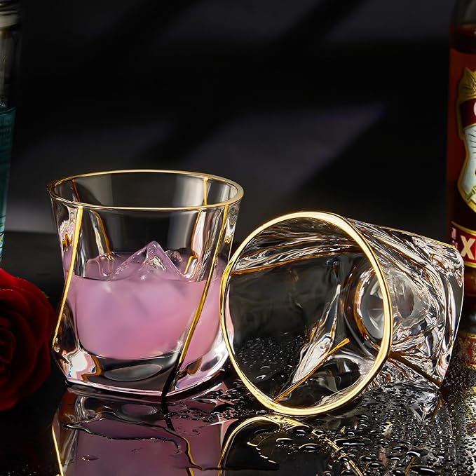 GLASKEY Crystal Whiskey Glasses Set of 2 with 24K Gold Rim,Bar Glasses,Twisted Whiskey Glass Gold Collection for Bourbon,Scotch and Wine,Rock Barware for Men Gift - 8oz